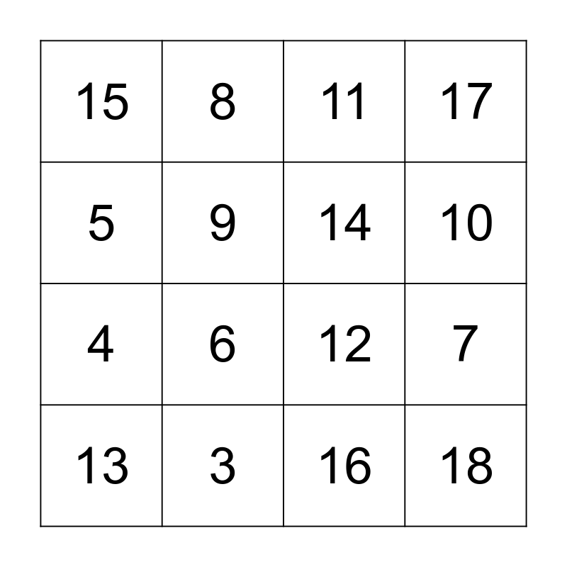 This bingo card has 16 words: 3, 7, 11, 15, 4, 8, 12, 16, 5, 9, 13, 17, 6, 10, 14 and 18.
