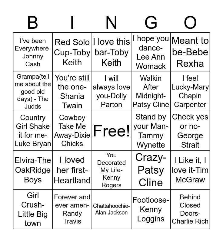 This bingo card has a free space and 32 words: Footloose-Kenny Loggins, Little White Church-Little Big Town, Cowboy Take Me Away-Dixie Chicks, Wagon Wheel-Darius Rucker, Elvira-The OakRidge Boys, You're still the one-Shania Twain, Meant to be-Bebe Rexha, I Like it, I love it-Tim McGraw, Red Solo Cup-Toby Keith, Stuck Like Glue-Sugarland, I will always love you-Dolly Parton, I love this bar-Toby Keith, Devil went down to Georgia-Charlie Daniels Band, Chicken Fried-Zac Brown Band, Stand by your Man-Tammy Wynette, Folsom Prison Blues-Johnny Cash, Girl Crush- Little Big town, Country Girl Shake it for me- Luke Bryan, You Decorated My Life-Kenny Rogers, I loved her first- Heartland, Crazy-Patsy Cline, Suds in the Bucket-Sara Evans, Check yes or no- George Strait, Forever and ever amen- Randy Travis, Behind Closed Doors-Charlie Rich, I hope you dance-Lee Ann Womack, Walkin After Midnight-Patsy Cline, Grampa(tell me about the good old days) - The Judds, I've been Everywhere-Johnny Cash, Chattahoochie-Alan Jackson, The night the lights went down in Georgia- Reba McEntire and I feel Lucky-Mary Chapin Carpenter.