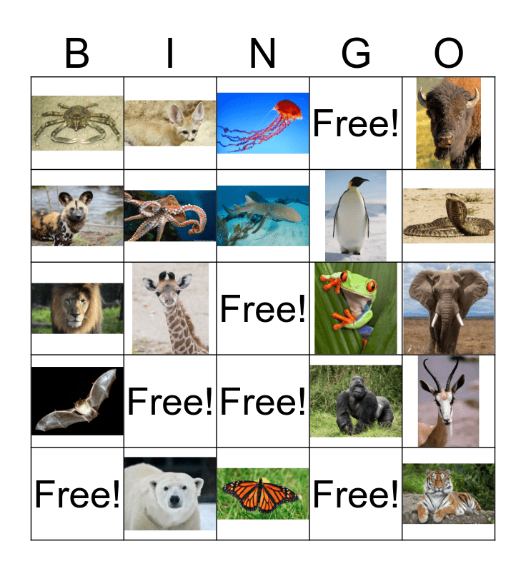This bingo card has 19 images, a free space and 5 words: Free!, Free!, Free!, Free! and Free!.