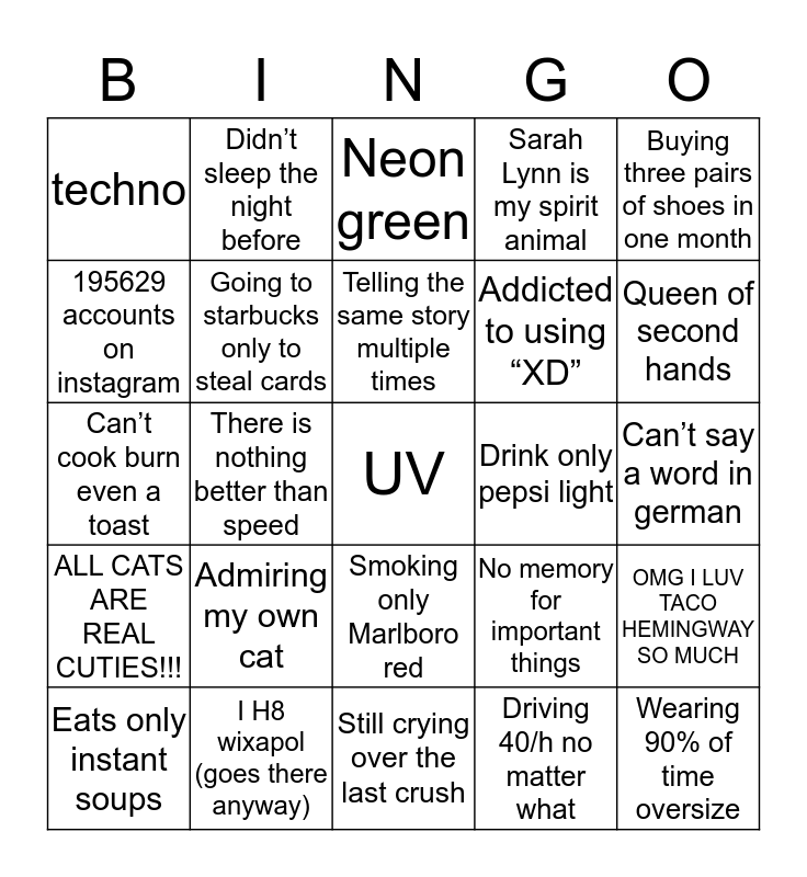 This bingo card has 25 words: ALL CATS ARE REAL CUTIES!!!, I H8 wixapol (goes there anyway), UV, Driving 40/h no matter what, Buying three pairs of shoes in one month, techno, Didn’t sleep the night before, Neon green, Drink only pepsi light, OMG I LUV TACO HEMINGWAY SO MUCH, 195629 accounts on instagram, Going to starbucks only to steal cards, Still crying over the last crush, No memory for important things, Queen of second hands, Eats only instant soups, There is nothing better than speed, Telling the same story multiple times, Addicted to using “XD”, Can’t say a word in german, Can’t cook burn even a toast, Admiring my own cat, Smoking only Marlboro red, Sarah Lynn is my spirit animal and Wearing 90% of time oversize.