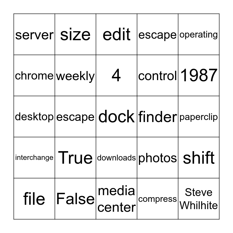 This bingo card has a free space and 24 words: True, False, 4, file, operating, server, chrome, size, finder, downloads, control, desktop, photos, shift, weekly, compress, paperclip, edit, 1987, escape, Steve Whilhite, interchange, escape and media center.