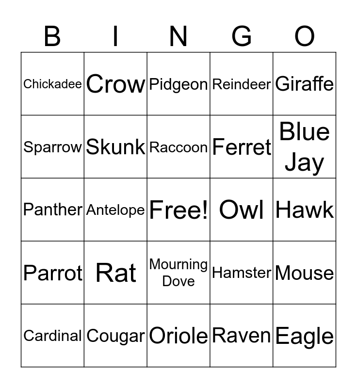 This bingo card has a free space and 37 words: Cat, Dog, Weasel, Skunk, Mouse, Rat, Raccoon, Possum, Giraffe, Lion, Antelope, Reindeer, Eagle, Hawk, Sparrow, Parrot, Seagull, Pidgeon, Mourning Dove, Owl, Chickadee, Blue Jay, Cardinal, Oriole, Blackbird, Raven, Crow, Stork, Egret, Rhinoceros, Bear, Cougar, Panther, Gerbil, Hamster, Ferret and Mink.