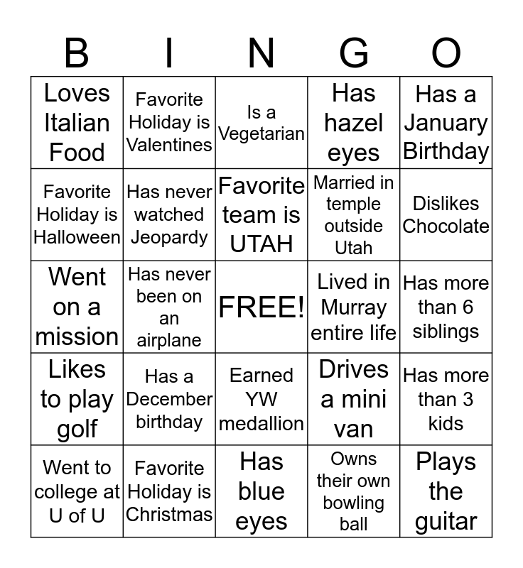 This bingo card has a free space and 24 words: Has a December birthday, Favorite Holiday is Christmas, Favorite team is UTAH, Went to college at U of U, Has a January Birthday, Loves Italian Food, Favorite Holiday is Halloween, Favorite Holiday is Valentines, Lived in Murray entire life, Earned YW medallion, Married in temple outside Utah, Went on a mission, Drives a mini van, Has more than 3 kids, Has never watched Jeopardy, Owns their own bowling ball, Has more than 6 siblings, Is a Vegetarian, Dislikes Chocolate, Has never been on an airplane, Plays the guitar, Likes to play golf, Has hazel eyes and Has blue eyes.