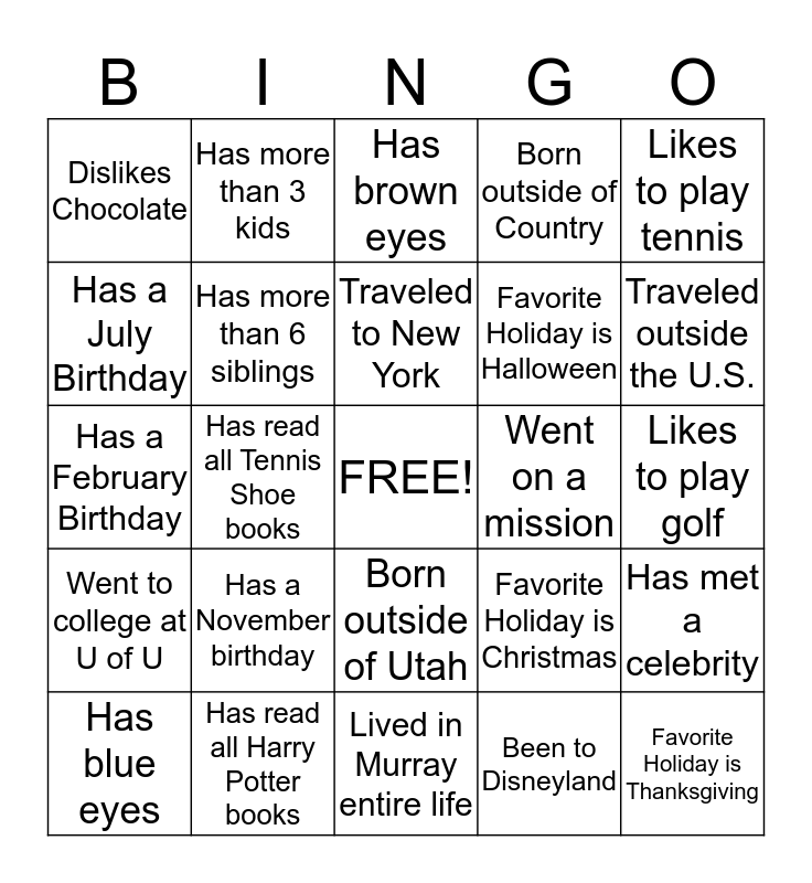 This bingo card has a free space and 24 words: Has a November birthday, Has read all Harry Potter books, Traveled to New York, Has blue eyes, Likes to play tennis, Dislikes Chocolate, Has a July Birthday, Has more than 3 kids, Went on a mission, Born outside of Utah, Favorite Holiday is Halloween, Has a February Birthday, Favorite Holiday is Christmas, Has met a celebrity, Has more than 6 siblings, Been to Disneyland, Likes to play golf, Has brown eyes, Traveled outside the U.S., Has read all Tennis Shoe books, Favorite Holiday is Thanksgiving, Went to college at U of U, Born outside of Country and Lived in Murray entire life.