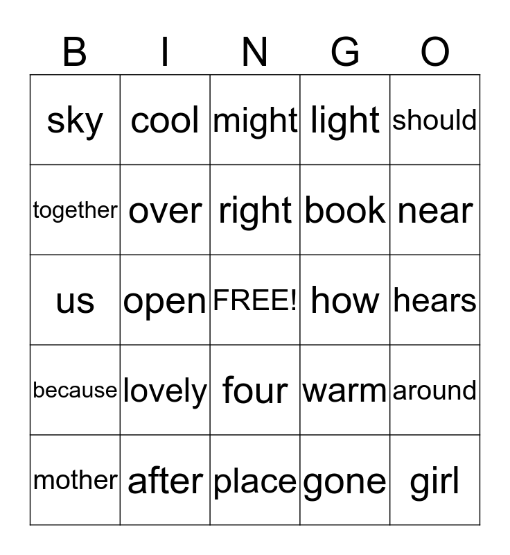 This bingo card has a free space and 24 words: lovely, after, right, mother, should, sky, together, cool, how, four, book, us, warm, around, over, gone, hears, might, near, open, girl, because, light and place.