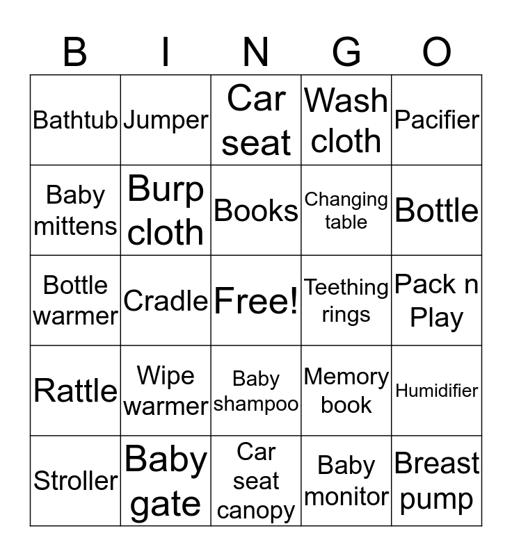 This bingo card has a free space and 58 words: Storage organizer, Baby gate, Bath toys, Rattle, Baby monitor, Swaddle blanket Bibs, Burp cloth, Receiving blanket, Changing table, Rocking chair, Wash cloth, Baby lotion, Swing, Bouncer, Baby wipes, Bathtub, Breast pump, Pacifier, Play mat, Books, Teething rings, Car seat, Stroller, Humidifier, Crib sheets, Pack n Play, Changing pad, Crib, Bottle, Diaper, Formula, Diaper bag, Hooded towel, Baby powder, Baby food, Baby socks, Onesies, Cradle, Bottle warmer, Diaper genie, Wipe warmer, Nasal aspirator, Memory book, Diaper rash cream, Mobile, High chair, Nail clipper, Baby shampoo, Car seat canopy, Dresser, Baby shoes, Changing pad cover, Lamp, Baby walker, Jumper, Car seat base, Baby mittens and Bottle drying rack.
