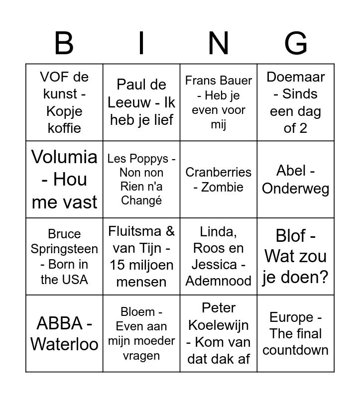 This bingo card has 30 words: Harrie Klorkestein - Oh, oh Den Haag, The Eagles - Hotel California, Blof - Wat zou je doen?, Bangles - Walk like an Egyptian, VOF de kunst - Kopje koffie, Frans Bauer - Heb je even voor mij, Cranberries - Zombie, Prince - Purple rain, Bloem - Even aan mijn moeder vragen, Oasis - Wonderwall, Peter Koelewijn - Kom van dat dak af, ABBA - Waterloo, Guus Meeuwis - Brabant, Village People - YMCA, Fluitsma & van Tijn - 15 miljoen mensen, Kaiser Chiefs - Ruby, Ciske de Rat - Ik voel me zo verdomd alleen, Europe - The final countdown, Shocking Blue - Venus, Volumia - Hou me vast, Linda, Roos en Jessica - Ademnood, Gloria Gaynor - I will survive, Paul de Leeuw - Ik heb je lief, Bruce Springsteen - Born in the USA, Les Poppys - Non non Rien n'a Changé, Doemaar - Sinds een dag of 2, Vader Abraham - Kleine café aan de haven, Toontje lager - Stiekem met je gedanst, Abel - Onderweg and Zangeres Zonder Naam - Mexico.