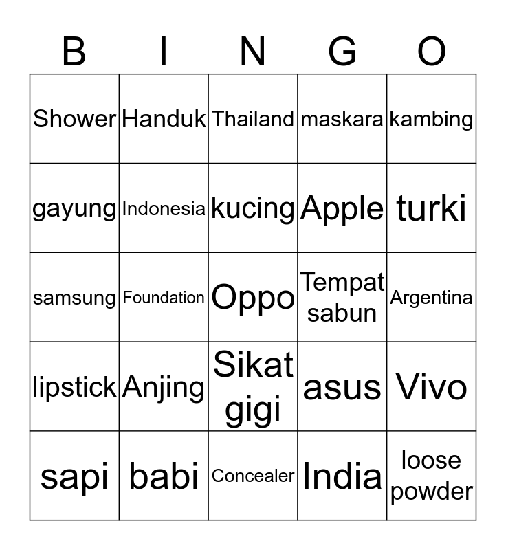 This bingo card has a free space and 24 words: Anjing, babi, kucing, sapi, kambing, Shower, gayung, Handuk, Tempat sabun, Sikat gigi, Apple, samsung, asus, Vivo, Indonesia, India, Argentina, Thailand, turki, Foundation, loose powder, lipstick, maskara and Concealer.