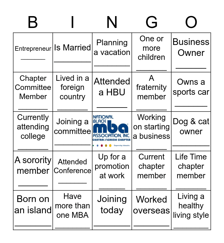 This bingo card has a free space and 24 words: Attended Conference _______, Have more than one MBA ________, Attended a HBU ______, Born on an island _______, Business Owner ______, Entrepreneur _______, Chapter Committee Member _______, Is Married ________, Working on starting a business _______, Up for a promotion at work ______, A fraternity member _______, Currently attending college _______, Current chapter member _______, Life Time chapter member _______, Lived in a foreign country _______, Worked overseas _______, Dog & cat owner ________, Planning a vacation ________, Owns a sports car _______, Joining a committee ________, Living a healthy living style ________, A sorority member ______, One or more children _______ and Joining today _______.