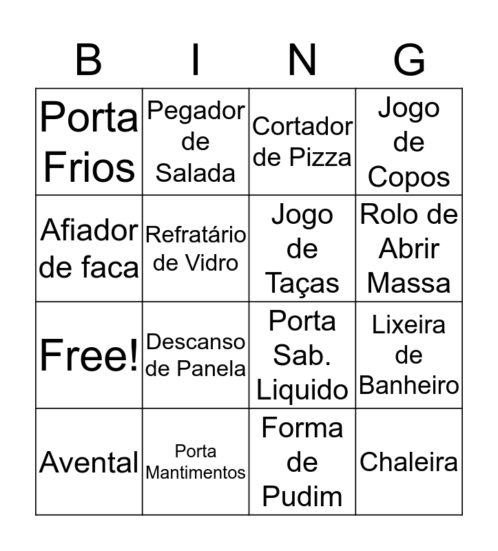 This bingo card has 57 words: Garrafa Térmica, Coador, Suporte de Coador, Jogo de Copos, Copo Americano, Panela de pressão elétrica, Jogo de Taças, Copo Medidor, Free!, Fuê, Cortador de Pizza, Descascador de legumes, Aspirador de pó, Abridor de Lata, Abridor de Garrafa, Saca Rolha, Afiador de faca, Descanso de Panela, Luva Térmica, Chaleira, Tabua de cortes, Tesoura de Cozinha, Jogo de xícaras, Rolo de Abrir Massa, Pegador de massa, Pegador de Salada, Pincel Culinário, Lixeira de Pia, Avental, Puxa Saco, Porta Detergente, Esponjas, Desentupidor, Escova Sanitária, Porta Sab. Liquido, Lixeira de Banheiro, Travessa, Refratário de Vidro, Frigideira, Potes Plásticos, Porta Frios, Porta Mantimentos, Tapete de Banheiro, Tapete Antiderrapante, Toalha de Rosto, Forma de Pizza, Forma de Pudim, Forma de Fundo Removível, Porta Temperos, Ralador de Queijo, Ralador de Legumes, Cesto de pregador, Prendedor de roupa, Porta Sabão em pó, Mangueira, Espelho and Cabide.