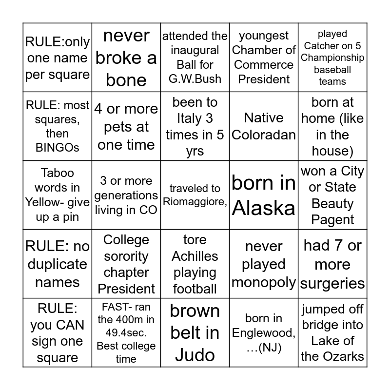 This bingo card has 25 words: RULE: no duplicate names, FAST- ran the 400m in 49.4sec. Best college time, traveled to Riomaggiore,, born in Englewood, …(NJ), played Catcher on 5 Championship baseball teams, RULE:only one name per square, never broke a bone, attended the inaugural Ball for G.W.Bush, born in Alaska, had 7 or more surgeries, RULE: most squares, then BINGOs, 4 or more pets at one time, brown belt in Judo, never played monopoly, born at home (like in the house), RULE: you CAN sign one square, 3 or more generations living in CO, been to Italy 3 times in 5 yrs, Native Coloradan, won a City or State Beauty Pagent, Taboo words in Yellow- give up a pin, College sorority chapter President, tore Achilles playing football, youngest Chamber of Commerce President and jumped off bridge into Lake of the Ozarks.