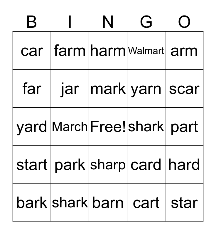 This bingo card has a free space and 24 words: park, shark, mark, bark, arm, car, far, farm, shark, sharp, yarn, yard, card, hard, jar, cart, part, harm, scar, March, star, start, Walmart and barn.