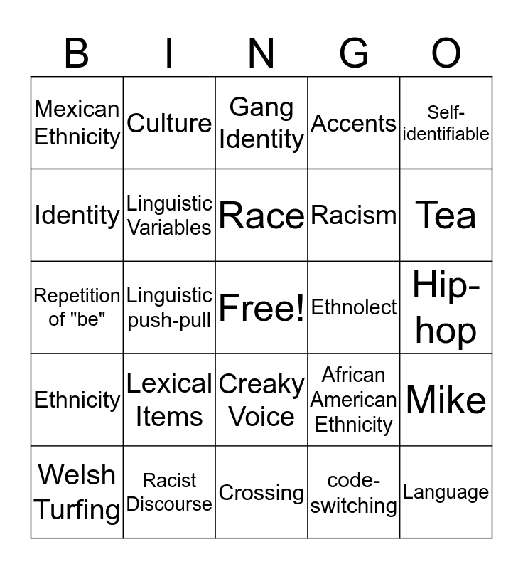 This bingo card has a free space and 27 words: African American Ethnicity, wogs, Racism, Crossing, Identity, Gang Identity, Culture, Ethnicity, Ethnolect, Mike, Repetition of "be", Accents, Welsh Turfing, Racist Discourse, Tea, Lumbee English, Linguistic Variables, Race, Lexical Items, Mexican Ethnicity, Hip-hop, code-switching, Linguistic push-pull, Language, Creaky Voice, Self-identifiable and European American English.