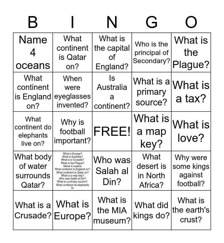 This bingo card has a free space and 24 words: What is Europe? What is Australia? What is a Crusade? What is the Plague? Name 4 oceans What continent is England on? What continent is Qatar on? What is a map key? Who was Salah al Din? What is a primary source?, What continent do elephants liv, What is Europe?, Is Australia a continent?, What is a Crusade?, What is the Plague?, Name 4 oceans, What continent is England on?, What continent is Qatar on?, What is a map key?, Who was Salah al Din?, What is a primary source?, What continent do elephants live on?, What desert is in North Africa?, Why were some kings against football?, When were eyeglasses invented?, What did kings do?, What is love?, What is the capital of England?, What is a tax?, Why is football important?, What is the earth's crust?, What body of water surrounds Qatar?, Who is the principal of Secondary? and What is the MIA museum?.