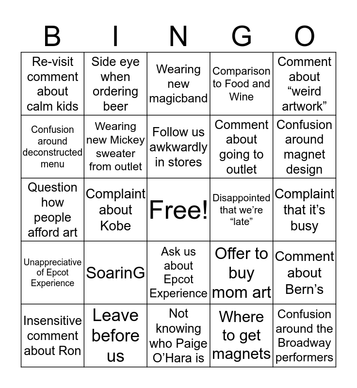 This bingo card has a free space and 29 words: Insensitive comment about Ron, Insensitive comment about Jay, Complaint about Kobe, Ask us what ships offer hibachi, Re-visit comment about calm kids, Wearing new magicband, Wearing new Mickey sweater from outlet, SoarinG, Disappointed that we’re “late”, Leave before us, Complaint that it’s busy, Confusion around the Broadway performers, Not knowing who Paige O’Hara is, Where to get magnets, Confusion around magnet design, Confusion around MouseGear Reno., Ask us about Epcot Experience, Unappreciative of Epcot Experience, Comment about “weird artwork”, Question how people afford art, Offer to buy mom art, Ask us if we’re buying art, Comment about going to outlet, Confusion around deconstructed menu, Comparison to Food and Wine, Side eye when ordering beer, Comment about Bern’s, Follow us awkwardly in stores and Comment about us being tour guides.