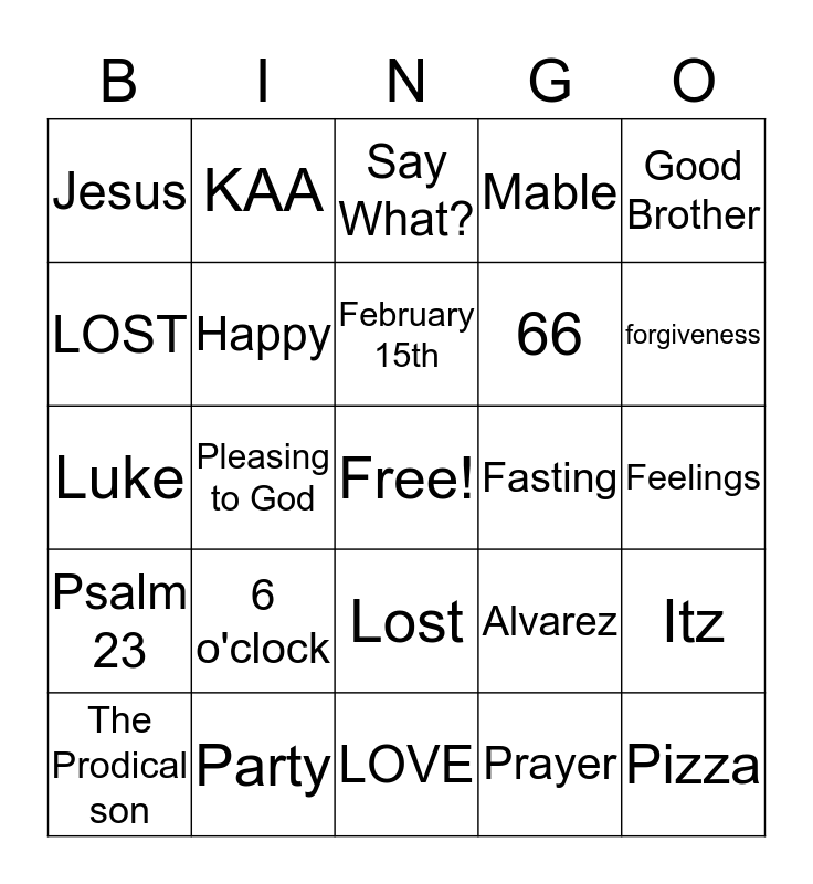 This bingo card has a free space and 29 words: The Prodical son, Middle School Rock, Pleasing to God, Found, Jesus, Say What?, Happy, 6 o'clock, Fasting, Party, Feelings, Pizza, LOVE, Prayer, forgiveness, Shepherd, Lost, Psalm 23, Good Brother, Luke, Alvarez, Want, 66, LOST, Mable, KAA, Itz, February 15th and Peace.