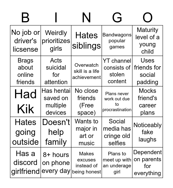 This bingo card has a free space and 24 words: Doesn't help family, 8+ hours on phone every day, Overwatch skill is a life achievement, Has a discord girlfriend, Maturity level of a young child, No job or driver's licsense, Brags about online friends, Weirdly prioritizes girls, Plans never work out due to procrastination, Wants to major in art or music, YT channel consists of stolen content, Had Kik, Social media has cringe old selfies, Noticeably fake laughs, Acts suicidal for attention, Plans to meet up with an underage girl, Mocks friend's career plans, Hates siblings, Uses friends for social padding, Has hentai saved on multiple devices, Dependent on parents for everything, Hates going outside, Bandwagons popular games and Makes excuses instead of being honest.