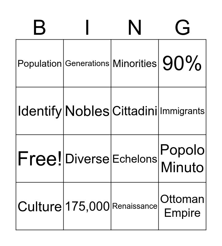 This bingo card has 20 words: Popolo Minuto, Ghettos, Minorities, Jewish, Culture, Identify, 175,000, Population, Free!, Generations, Diverse, Echelons, Nobles, Ottoman Empire, Cittadini, Venice, Immigrants, 90%, Renaissance and Nobles.