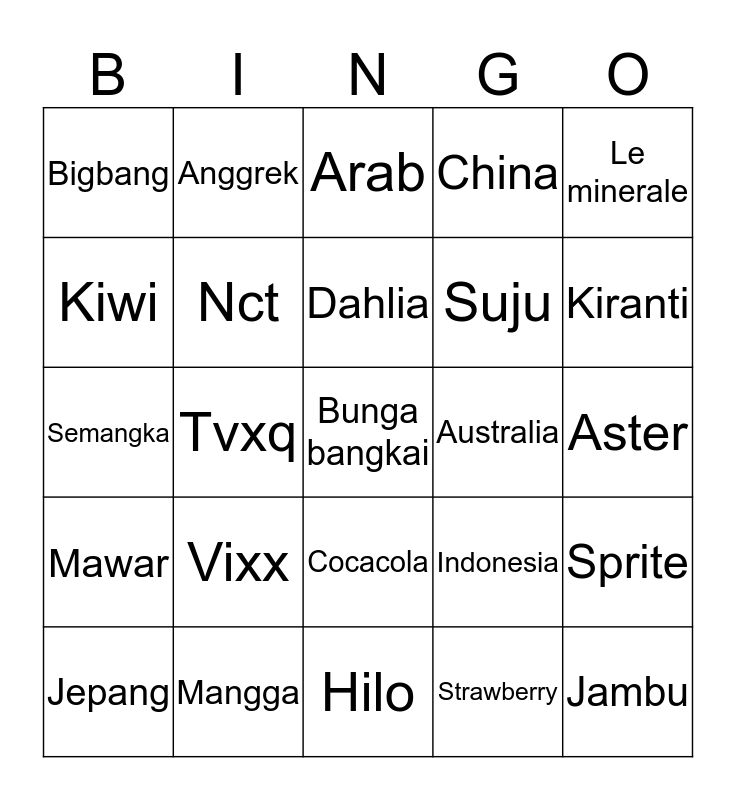 This bingo card has a free space and 24 words: Vixx, Mangga, Dahlia, Jepang, Le minerale, Bigbang, Kiwi, Anggrek, Australia, Cocacola, Suju, Semangka, Indonesia, Sprite, Nct, Strawberry, Aster, Arab, Kiranti, Tvxq, Jambu, Mawar, China and Hilo.