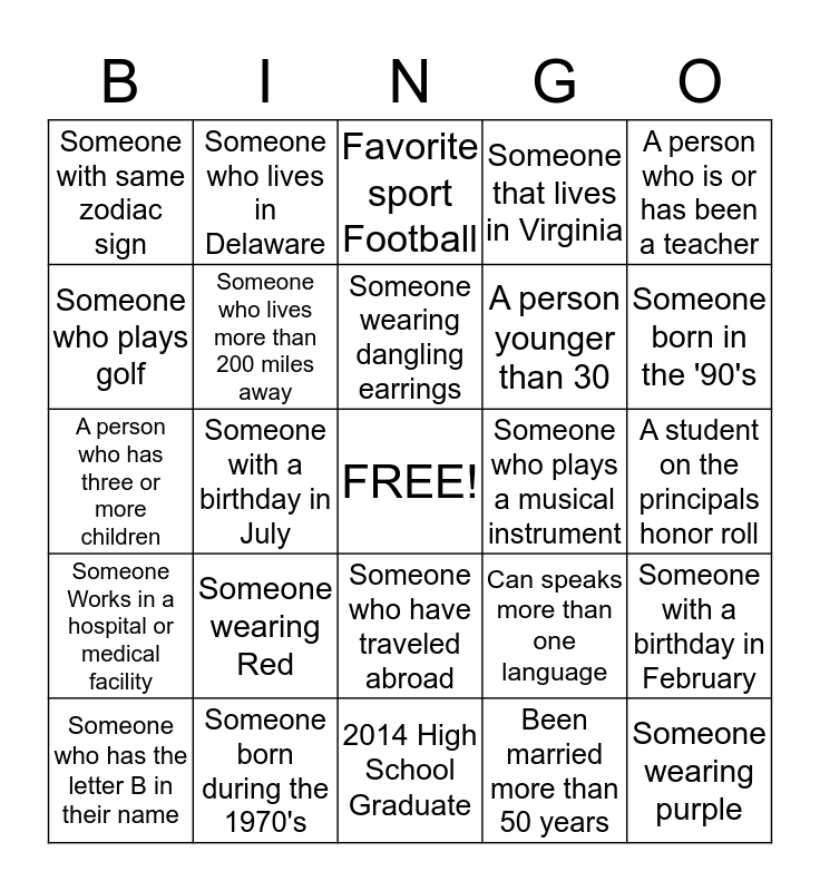 This bingo card has a free space and 24 words: Someone wearing Red, Someone born during the 1970's, Someone wearing dangling earrings, Someone who has the letter B in their name, A person who is or has been a teacher, Someone with same zodiac sign, Someone who plays golf, Someone who lives in Delaware, Someone who plays a musical instrument, Someone who have traveled abroad, A person younger than 30, A person who has three or more children, Can speaks more than one language, Someone with a birthday in February, Someone who lives more than 200 miles away, Been married more than 50 years, A student on the principals honor roll, Favorite sport Football, Someone born in the '90's, Someone with a birthday in July, Someone wearing purple, Someone Works in a hospital or medical facility, Someone that lives in Virginia and 2014 High School Graduate.