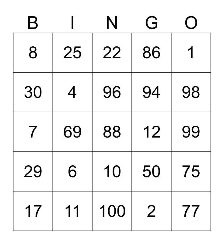 This bingo card has a free space and 24 words: 6, 11, 96, 17, 1, 8, 30, 25, 12, 10, 94, 7, 50, 75, 4, 2, 99, 22, 98, 69, 77, 29, 86 and 100.