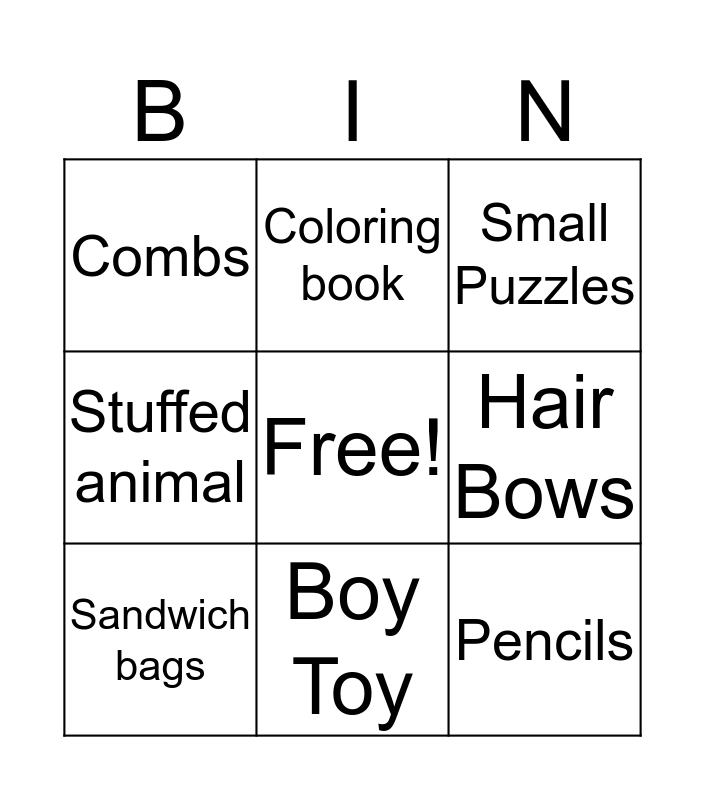 This bingo card has a free space and 13 words: Soap, Washcloths, Sandwich bags, Coloring book, Stuffed animal, Pencils, Pens, Girl Toy, Boy Toy, Combs, Hair Bows, Small Puzzles and $9 S/H.