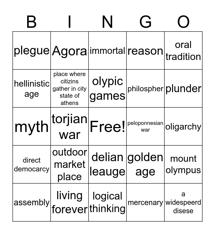 This bingo card has a free space and 24 words: outdoor market place, living forever, olypic games, assembly, oral tradition, plegue, hellinistic age, Agora, peloponnesian war, delian leauge, philospher, myth, golden age, mount olympus, place where citizins gather in city state of athens, mercenary, oligarchy, immortal, plunder, torjian war, a widespeerd disese, direct democarcy, reason and logical thinking.