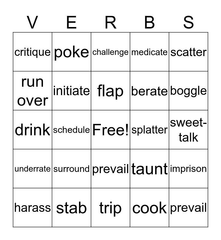 This bingo card has a free space and 24 words: surround, stab, flap, harass, scatter, critique, run over, poke, splatter, prevail, berate, drink, taunt, imprison, initiate, cook, sweet-talk, challenge, boggle, schedule, prevail, underrate, medicate and trip.