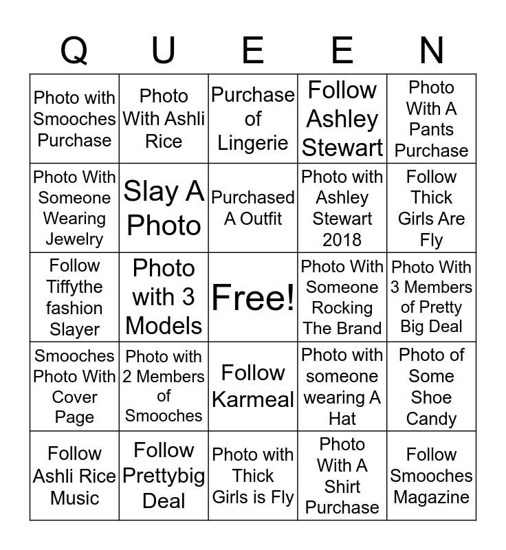 This bingo card has a free space and 24 words: Photo with 2 Members of Smooches, Follow Prettybig Deal, Purchased A Outfit, Follow Ashli Rice Music, Photo With A Pants Purchase, Photo with Smooches Purchase, Photo With Someone Wearing Jewelry, Photo With Ashli Rice, Photo With Someone Rocking The Brand, Follow Karmeal, Photo with Ashley Stewart 2018, Follow Tiffythe fashion Slayer, Photo with someone wearing A Hat, Photo of Some Shoe Candy, Slay A Photo, Photo With A Shirt Purchase, Photo With 3 Members of Pretty Big Deal, Purchase of Lingerie, Follow Thick Girls Are Fly, Photo with 3 Models, Follow Smooches Magazine, Smooches Photo With Cover Page, Follow Ashley Stewart and Photo with Thick Girls is Fly.