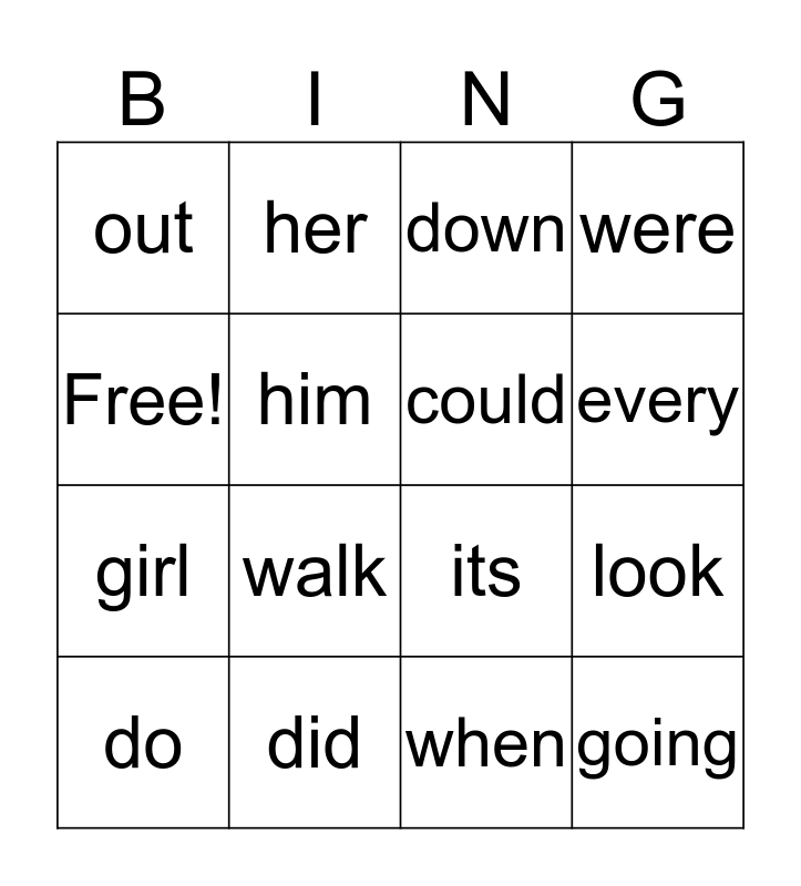 This bingo card has 16 words: did, look, down, out, girl, her, its, when, Free!, him, do, were, walk, every, could and going.