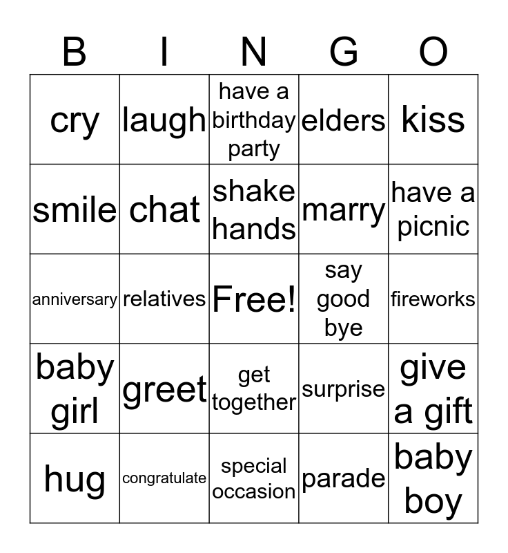 This bingo card has a free space and 24 words: greet, congratulate, shake hands, hug, kiss, cry, smile, laugh, say good bye, get together, marry, anniversary, surprise, give a gift, chat, parade, fireworks, have a birthday party, have a picnic, relatives, baby boy, baby girl, elders and special occasion.