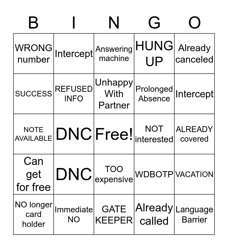 This bingo card has a free space and 24 words: DNC, Immediate NO, Unhappy With Partner, NO longer card holder, Already canceled, WRONG number, SUCCESS, Intercept, NOT interested, TOO expensive, Prolonged Absence, NOTE AVAILABLE, WDBOTP, VACATION, REFUSED INFO, Already called, ALREADY covered, Answering machine, Intercept, DNC, Language Barrier, Can get for free, HUNG UP and GATE KEEPER.