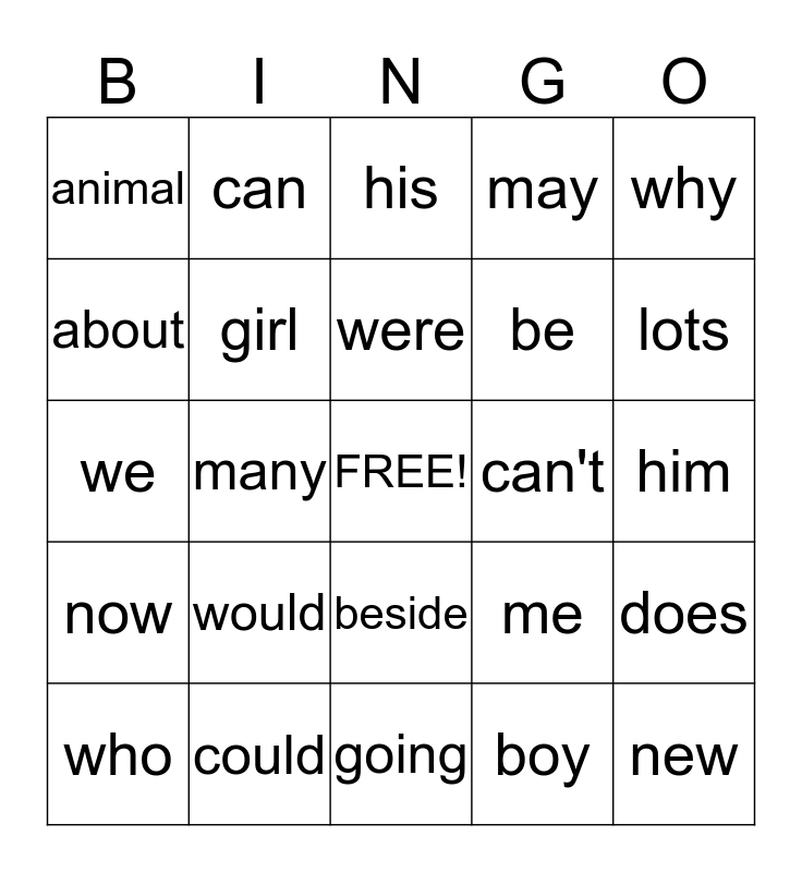 This bingo card has a free space and 24 words: would, could, were, who, why, animal, about, can, can't, beside, be, we, me, does, girl, boy, him, his, lots, many, new, now, may and going.