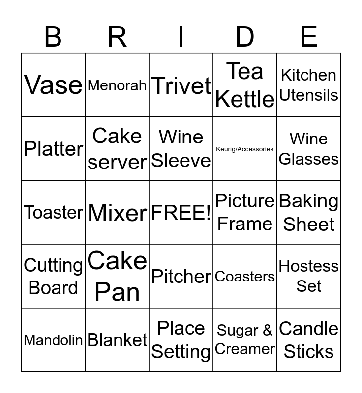 This bingo card has a free space and 31 words: Place Setting, Bowls, Mixer, Flatwear Place Setting, Vase, Trivet, Cake server, Coasters, Picture Frame, Sugar & Creamer, Baking Sheet, Candle Sticks, Pie Dish, Cake Stand, Wine Glasses, Beer Glasses, Hostess Set, Cake Pan, Cutting Board, Pitcher, Kitchen Utensils, Tupperware, Mandolin, Menorah, Keurig/Accessories, Platter, Tea Kettle, Toaster, Blanket, Wine Sleeve and Ice bucket.