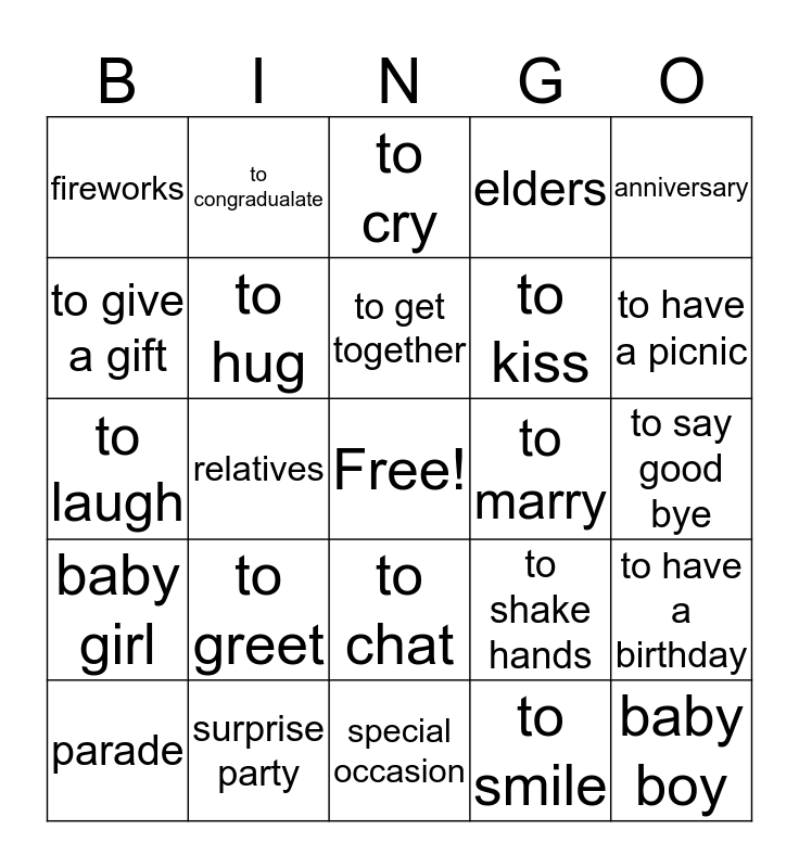 This bingo card has a free space and 24 words: to greet, surprise party, to get together, parade, anniversary, fireworks, to give a gift, to congradualate, to marry, to chat, to kiss, to laugh, to shake hands, to have a birthday, to hug, to smile, to say good bye, to cry, to have a picnic, relatives, baby boy, baby girl, elders and special occasion.