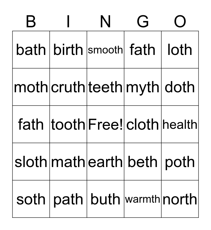 This bingo card has a free space and 24 words: math, path, teeth, soth, loth, bath, moth, birth, cloth, earth, myth, fath, beth, poth, cruth, warmth, health, smooth, doth, tooth, north, sloth, fath and buth.