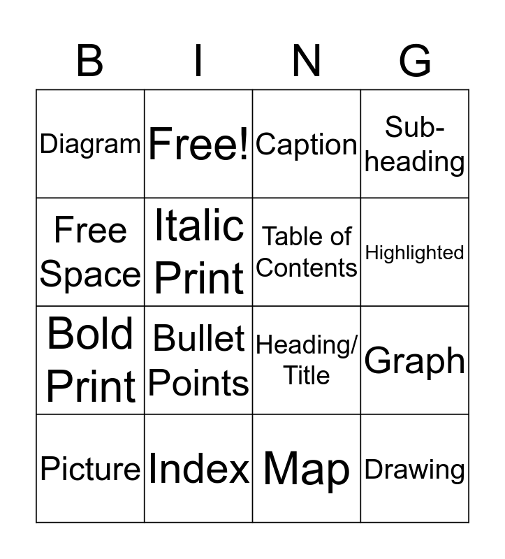 This bingo card has 19 words: Heading/ Title, Glossary, Caption, Drawing, Graph, Free Space, Map, Diagram, Free!, Bold Print, Bullet Points, Italic Print, Table of Contents, Index, Picture, Table, Sub-heading, Highlighted and Timeline.