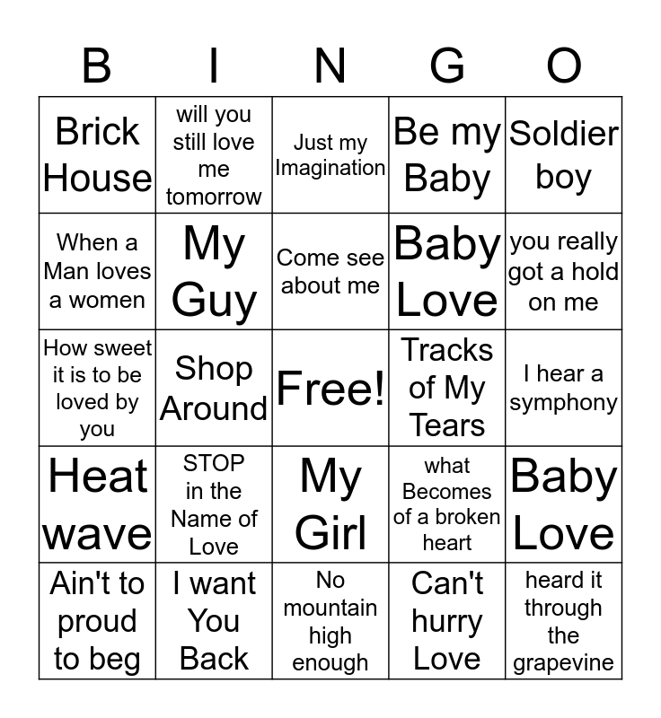 This bingo card has a free space and 29 words: Ain't to proud to beg, Dancing in the streets, Shop Around, Please Mr. Postman, Brick House, Just my Imagination, My Guy, STOP in the Name of Love, Tracks of My Tears, I want You Back, I hear a symphony, heard it through the grapevine, No mountain high enough, Can't hurry Love, you really got a hold on me, Midnight Train, My Girl, Heat wave, Soldier boy, How sweet it is to be loved by you, what Becomes of a broken heart, Stand by me, Baby Love, When a Man loves a women, Be my Baby, will you still love me tomorrow, Baby Love, Come see about me and I saw mommy kissing Santa Clause.