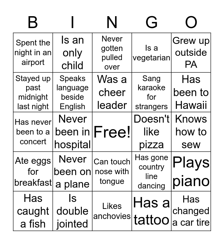 This bingo card has a free space and 29 words: Has caught a fish, Lived in more than 5 places, Never been in hospital, Has a celebrity auto graph, Spent the night in an airport, Never gotten pulled over, Speaks language beside English, Never been on a plane, Doesn't like pizza, Is double jointed, Knows how to sew, Has changed a car tire, Likes anchovies, Has a tattoo, Has been to Hawaii, Has more than 4 siblings, Can touch nose with tongue, Ate eggs for breakfast, Grew up outside PA, Has never been to a concert, Has gone country line dancing, Has a size 6 shoe, Sang karaoke for strangers, Stayed up past midnight last night, Is a vegetarian, Is an only child, Plays piano, Was a cheer leader and Still has a wisdom tooth.