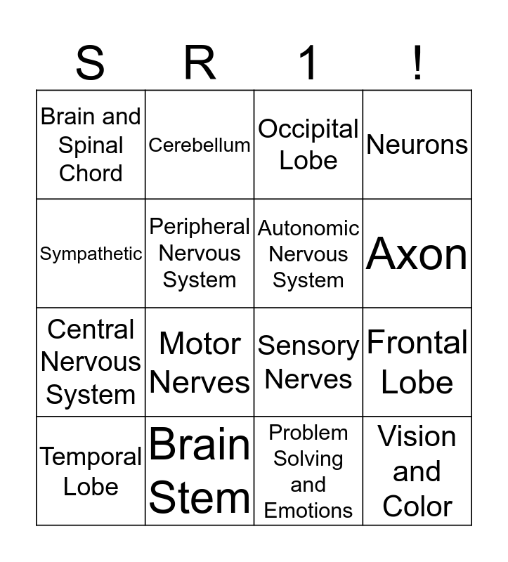 This bingo card has 20 words: Frontal Lobe, Parietal Lobe, Occipital Lobe, Parasympathetic, Temporal Lobe, Sympathetic, Brain Stem, Brain and Spinal Chord, Central Nervous System, Cerebellum, Motor Nerves, Sensory Nerves, Peripheral Nervous System, Vision and Color, Autonomic Nervous System, Dendrite, Axon, Neurons, Problem Solving and Emotions and Breathing, Sleep, and Swallowing.