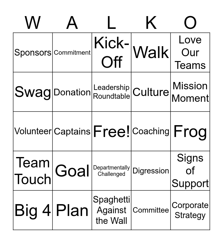This bingo card has a free space and 24 words: Goal, Plan, Leadership Roundtable, Big 4, Love Our Teams, Sponsors, Swag, Commitment, Coaching, Departmentally Challenged, Culture, Volunteer, Digression, Signs of Support, Donation, Committee, Frog, Kick-Off, Mission Moment, Captains, Corporate Strategy, Team Touch, Walk and Spaghetti Against the Wall.