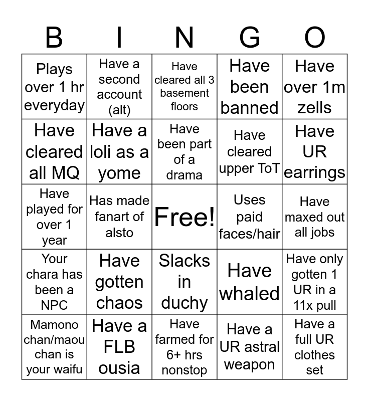 This bingo card has a free space and 24 words: Mamono chan/maou chan is your waifu, Have gotten chaos, Have been part of a drama, Have a UR astral weapon, Have over 1m zells, Plays over 1 hr everyday, Have a second account (alt), Have cleared all 3 basement floors, Uses paid faces/hair, Have maxed out all jobs, Have played for over 1 year, Have a loli as a yome, Have whaled, Have only gotten 1 UR in a 11x pull, Have cleared all MQ, Have a FLB ousia, Have farmed for 6+ hrs nonstop, Have been banned, Have UR earrings, Your chara has been a NPC, Has made fanart of alsto, Slacks in duchy, Have cleared upper ToT and Have a full UR clothes set.