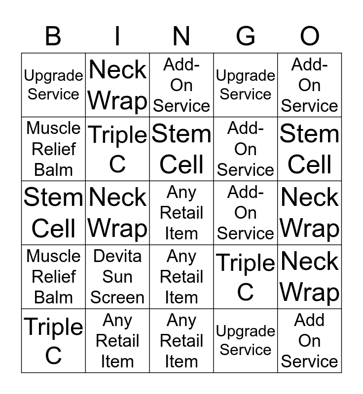 This bingo card has a free space and 24 words: Devita Sun Screen, Any Retail Item, Stem Cell, Triple C, Add-On Service, Upgrade Service, Muscle Relief Balm, Neck Wrap, Add-On Service, Any Retail Item, Add-On Service, Stem Cell, Triple C, Neck Wrap, Triple C, Upgrade Service, Neck Wrap, Add-On Service, Stem Cell, Neck Wrap, Add On Service, Muscle Relief Balm, Upgrade Service and Any Retail Item.