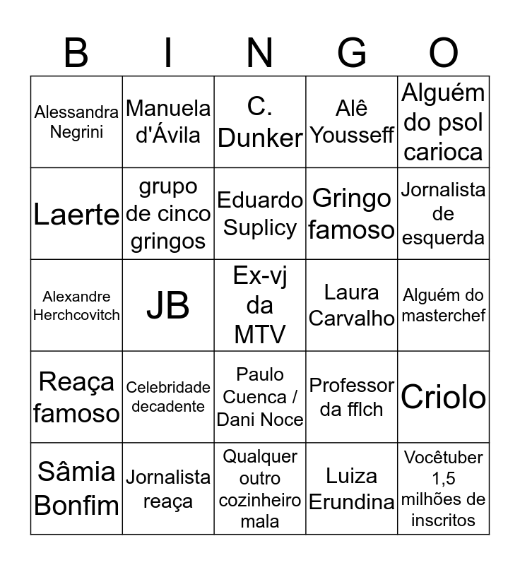 This bingo card has 33 words: Vocêtuber 1,5 milhões de inscritos, Vocêtuber 1 milhão de inscritos, JB, Ator global de esquerda, Reaça famoso, grupo de cinco gringos, Alguém do psol carioca, Sâmia Bonfim, Manuela d'Ávila, Haddad, Eduardo Suplicy, C. Dunker, M. Rita Kehl, Guilherme Boulos, Laura Carvalho, Jornalista de esquerda, Jornalista reaça, Alexandre Herchcovitch, Celebridade decadente, Professor da fflch, Paulo Cuenca / Dani Noce, Supla, Alessandra Negrini, Alguém do masterchef, Qualquer outro cozinheiro mala, Ex-vj da MTV, Alê Yousseff, Gringo famoso, Laerte, Criolo, Cartunista famosinho, Luiza Erundina and Juca Kfouri.
