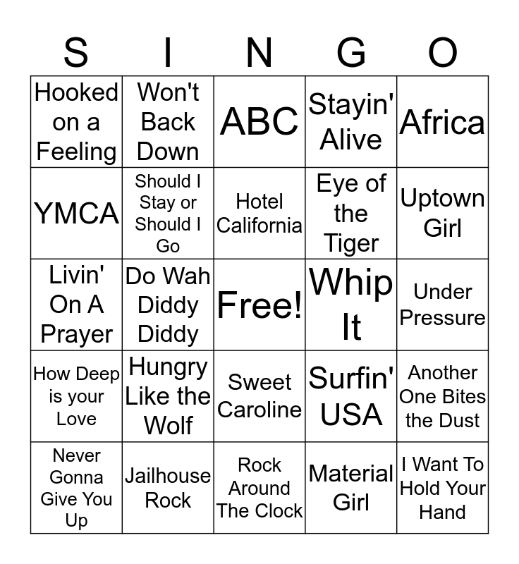 This bingo card has a free space and 64 words: Don't Stop Believin', Carry on Wayward Son, Final Countdown, Another One Bites the Dust, Sweet Child O' Mine, In The Air Tonight, Won't Back Down, Rocket Man, Hotel California, Brown Eyed Girl, Sweet Caroline, Back In Black, Under Pressure, Africa, You Make My Dreams, YMCA, Do Wah Diddy Diddy, Hooked on a Feeling, Smoke on the Water, Eye of the Tiger, Hungry Like the Wolf, How Deep is your Love, Stayin' Alive, Karma Chameleon, Heat Of The Moment, Every Breath You Take, Easy, Hot Blooded, My Girl, Don't You (forget about me), Bennie And The Jets, Wake Me Up Before You Go-Go, The Flame, Footloose, Uptown Girl, Never Gonna Give You Up, Jump, Material Girl, Say Say Say, Should I Stay or Should I Go, Livin' On A Prayer, Whip It, 9 to 5, Manic Monday, Stand By Me, I Want To Hold Your Hand, Jailhouse Rock, The Lion Sleeps Tonight, Surfin' USA, Spirit in the Sky, Ring of Fire, Tutti Frutti, Rock Around The Clock, La Bamba, Smooth Criminal, Thriller, ABC, Margarita-ville, Check Yes Or No, Achey Breaky Heart, She Thinks My Tractor's Sexy, Don't Let Your Babies Grow Up., Man! I Feel Like A Woman and Slide.