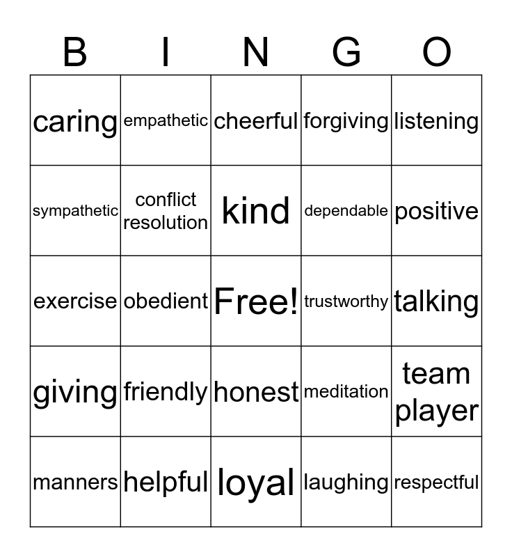 This bingo card has a free space and 24 words: friendly, helpful, kind, manners, listening, caring, sympathetic, empathetic, trustworthy, honest, dependable, exercise, meditation, team player, conflict resolution, laughing, talking, cheerful, positive, obedient, respectful, giving, forgiving and loyal.