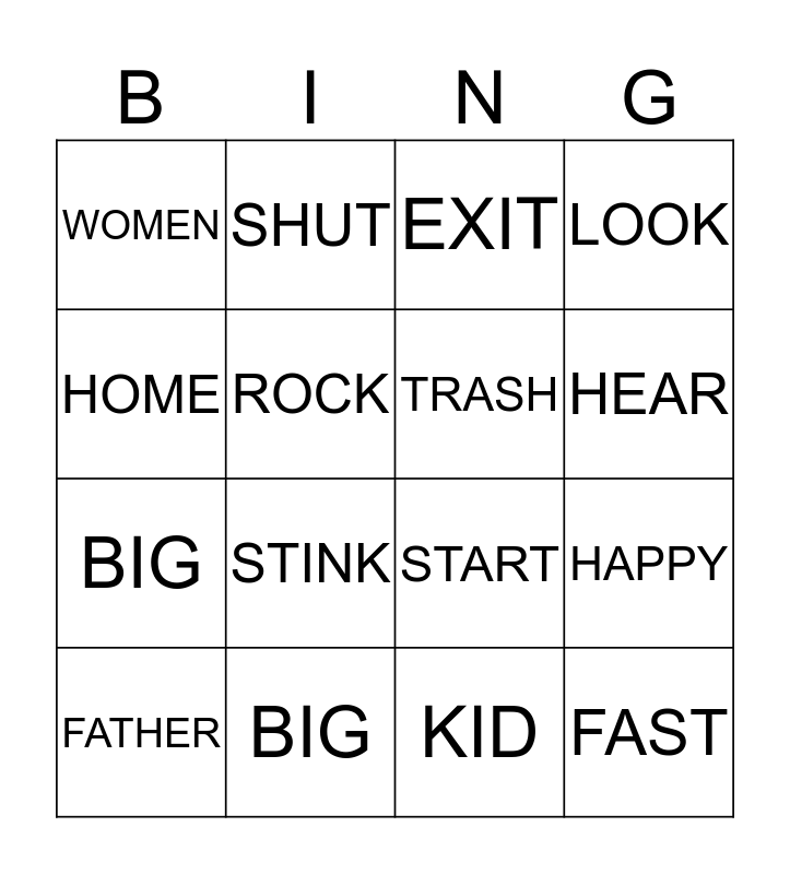 This bingo card has 16 words: BIG, HAPPY, EXIT, WOMEN, BIG, SHUT, START, KID, HOME, ROCK, FATHER, LOOK, STINK, HEAR, TRASH and FAST.