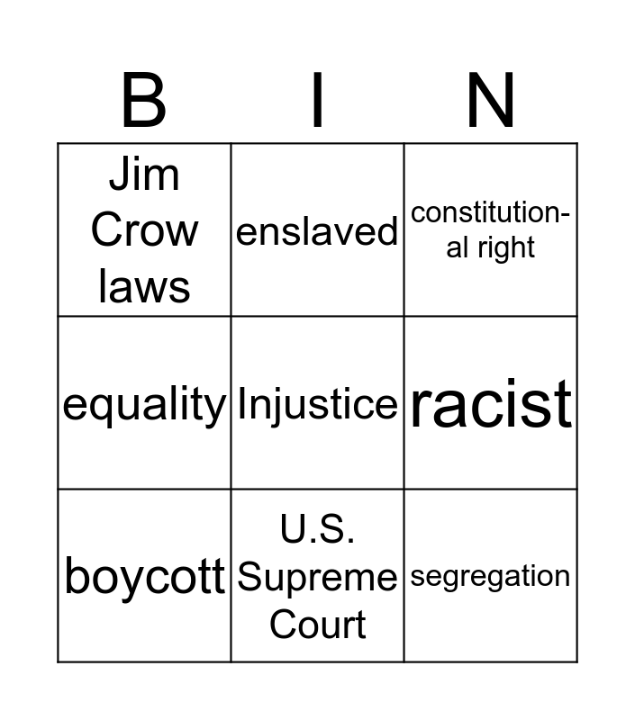 This bingo card has a free space and 9 words: boycott, constitution-al right, enslaved, equality, Jim Crow laws, racist, segregation, unconstitutional and U.S. Supreme Court.