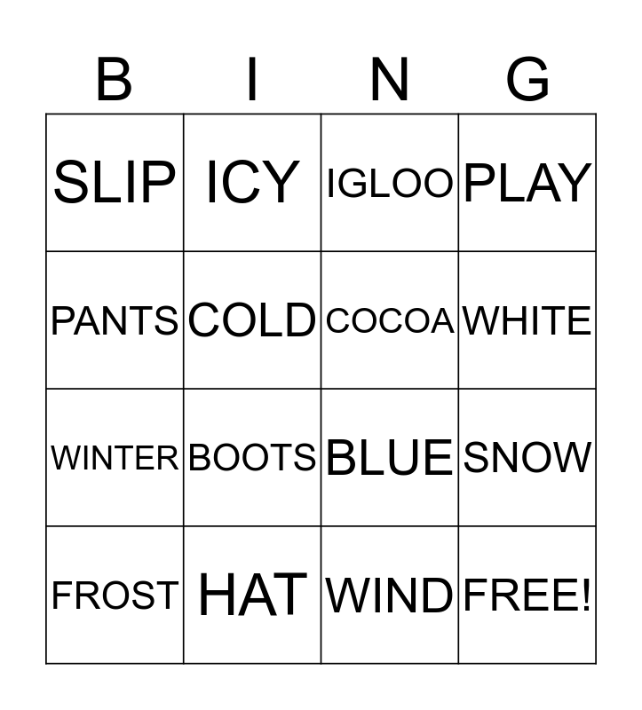 This bingo card has 20 words: SNOW, DARK, IGLOO, GLOVES, FROST, PANTS, HAT, SLIP, WINTER, ICY, BOOTS, BLUE, COLD, FREE!, COCOA, WET, WHITE, PLAY, WIND and LONG.