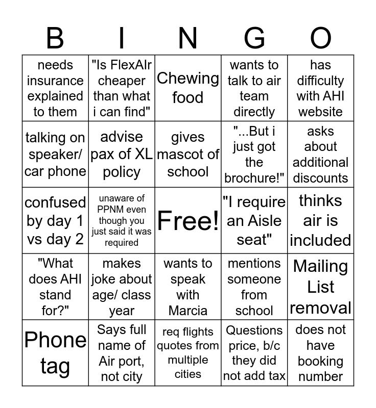 This bingo card has a free space and 28 words: Mailing List removal, STHSON pax calls to book air before res, "...But i just got the brochure!", Questions price, b/c they did not add tax, talking on speaker/ car phone, Chewing food, "Is FlexAIr cheaper than what i can find", "What does AHI stand for?", "I require an Aisle seat", Phone tag, confused by day 1 vs day 2, wants to talk to air team directly, Says full name of Air port, not city, req flights quotes from multiple cities, asks about additional discounts, asks about weather, makes joke about age/ class year, advise pax of XL policy, gives mascot of school, wants to speak with Marcia, needs insurance explained to them, clarifies that "single" means room to self, does not have booking number, unaware of PPNM even though you just said it was required, thinks air is included, mentions someone from school, has difficulty with AHI website and pax cannot hear.